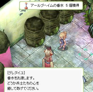 もって行った花を香水にしたものをホームシックになっている兵士に使えと言われる。